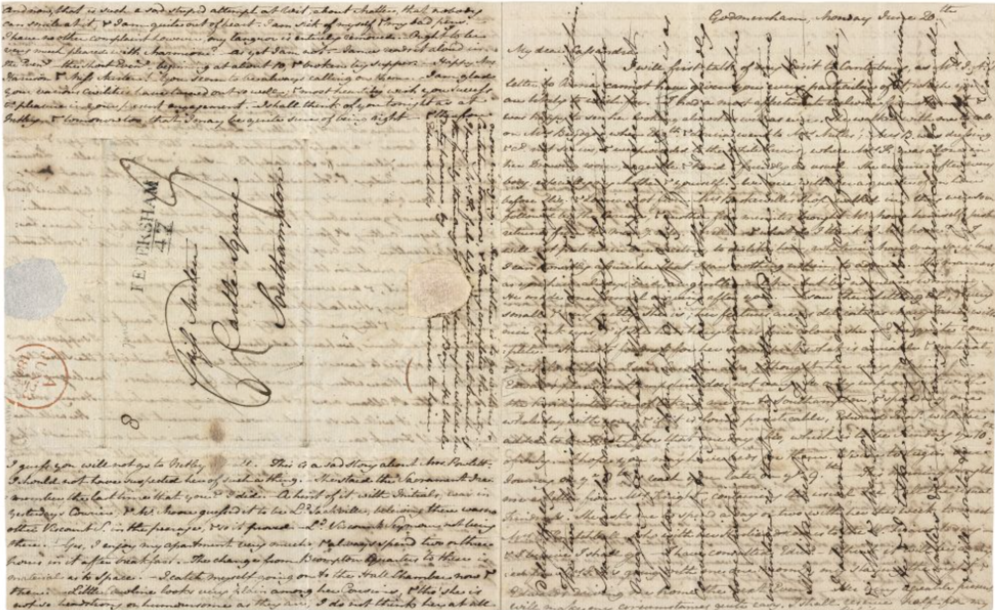 Autograph letter signed, dated Godmersham, 20-22 June 1808, to Cassandra Austen