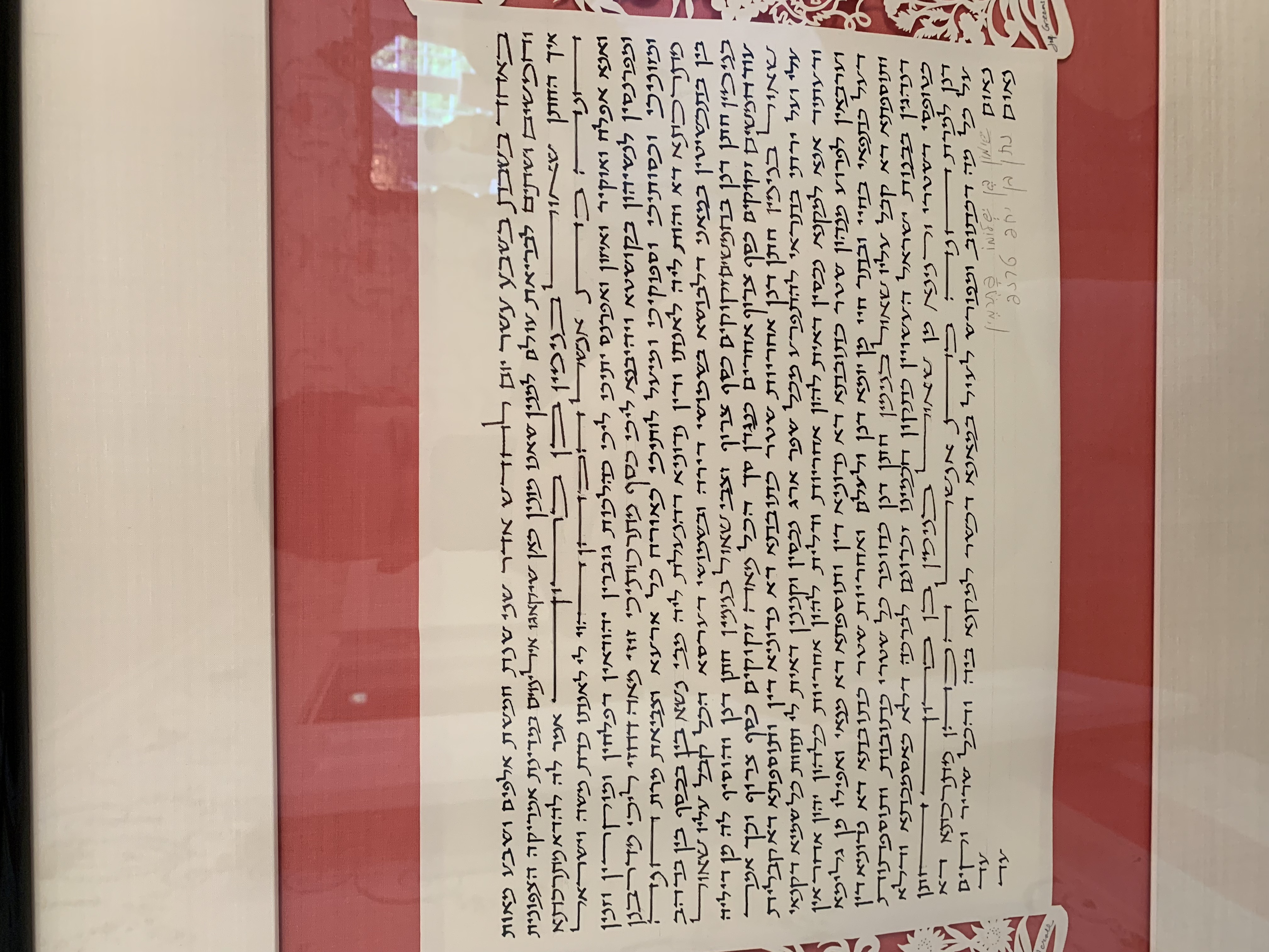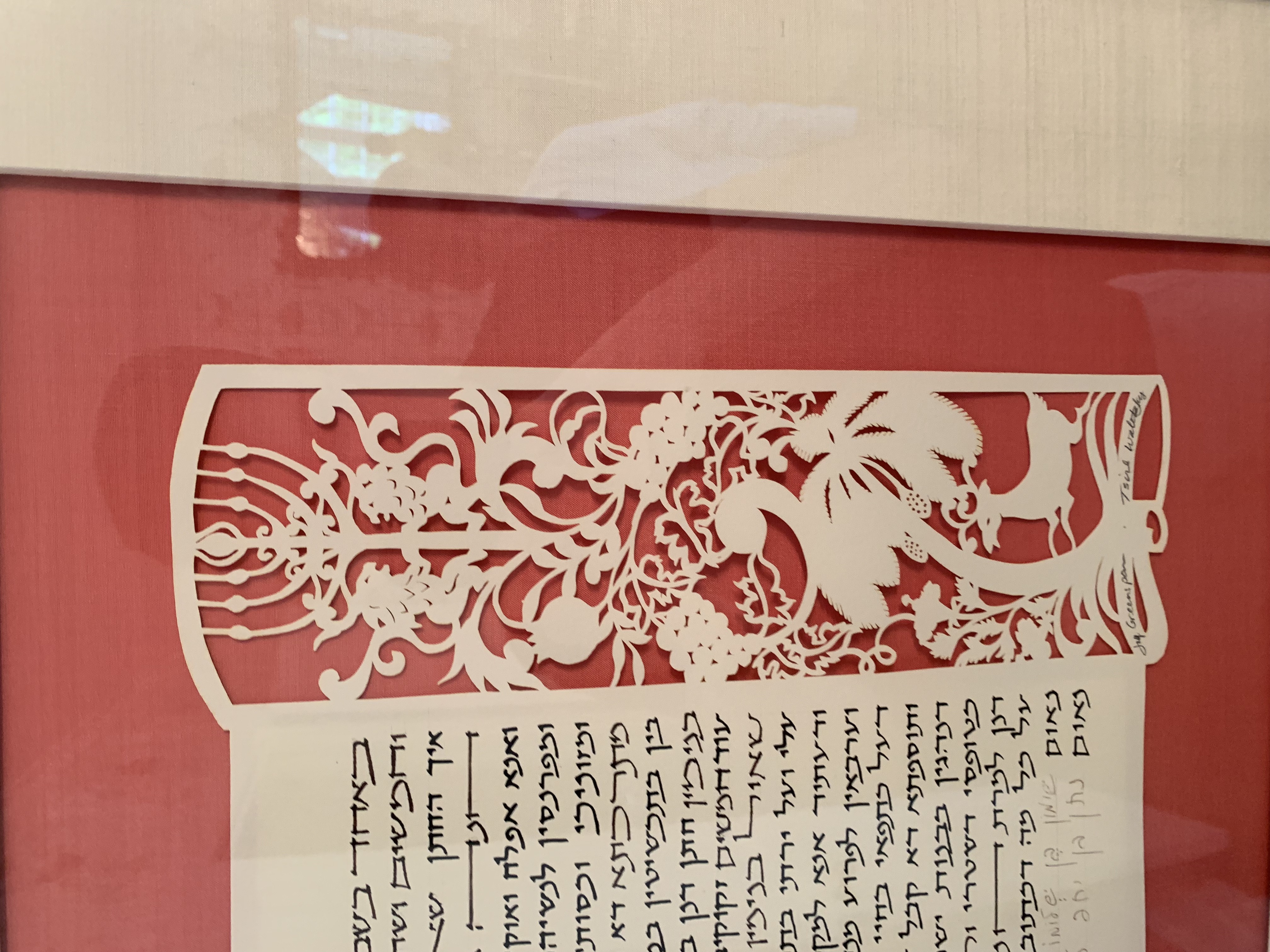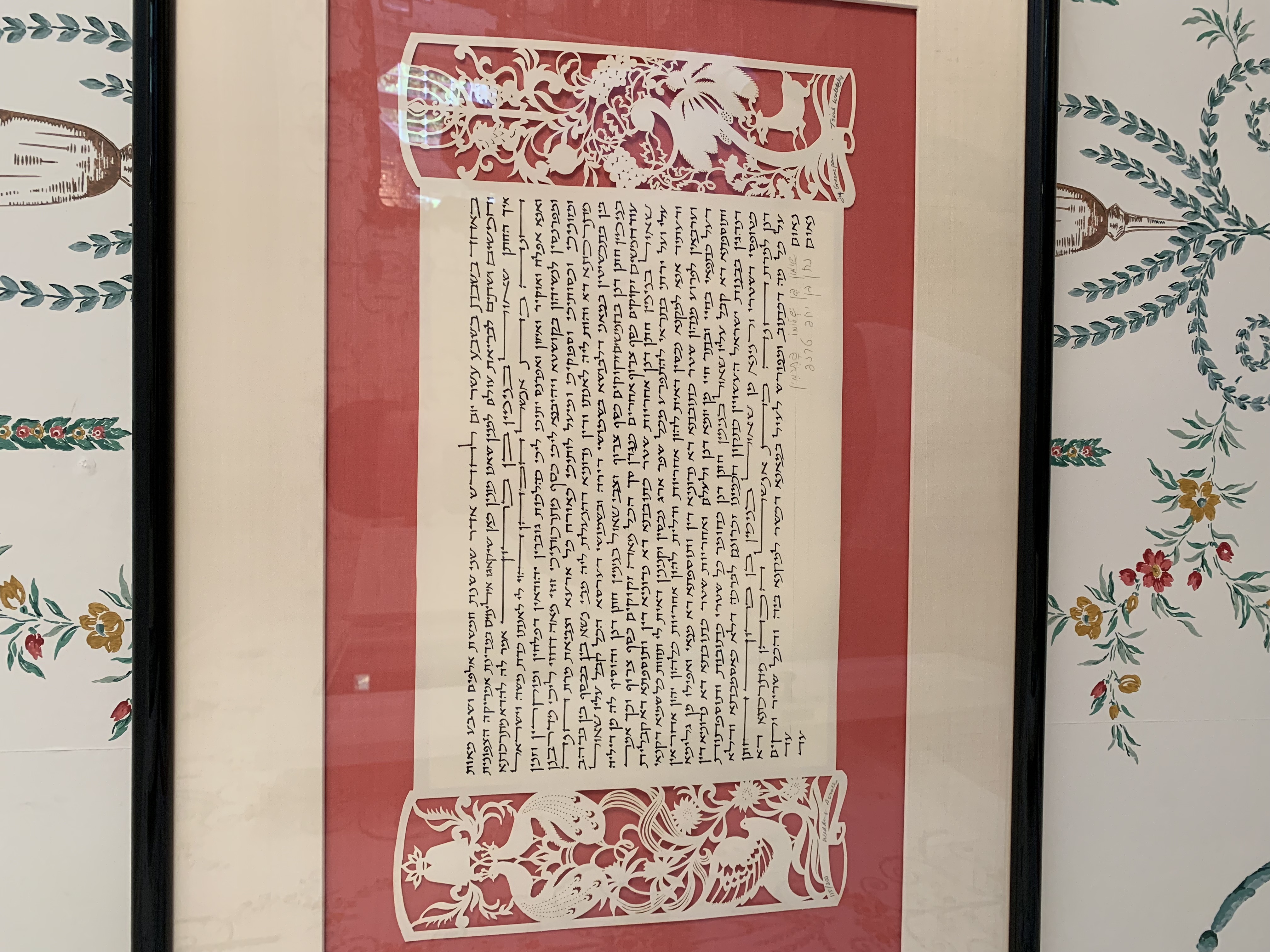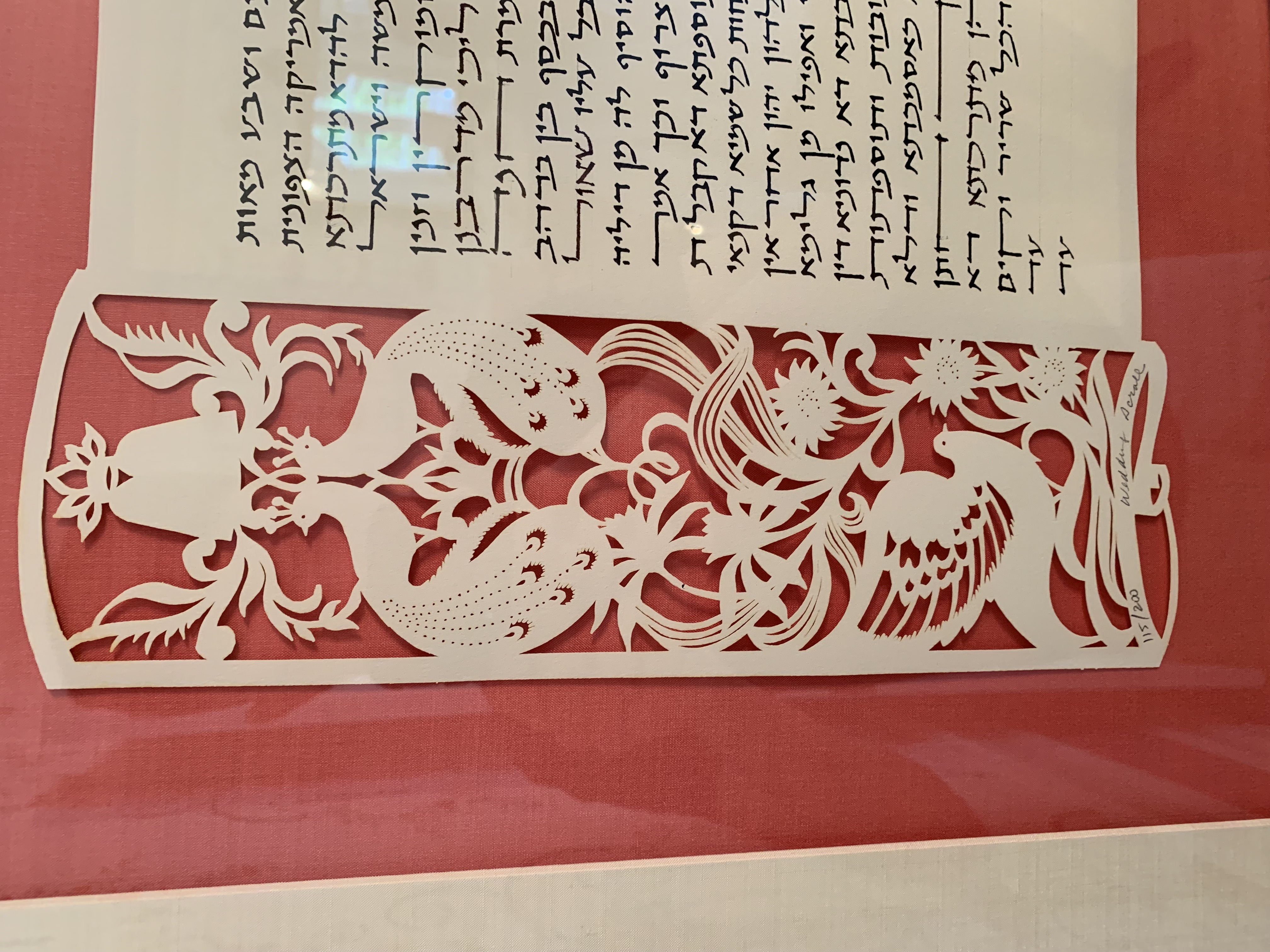 This is the ceremonial Jewish Ketuba/h that married Carolyn Rosenberg and Steven Nasatir (parents of Eli Nasatir) in 1992. A Ketubah is a traditional Jewish prenuptial contract that establishes the responsibilities between the soon-to-be wed pair. The Ketubah is designed by a sofer and is traditionally written in Aramaic, not Hebrew. This particular Ketubah has an especially intricate floral cutout design decorating both sides of the physical text that lies the middle, this specific design pattern has 200 in circulation and this copy was number 115/200. The sofer (scribe) of this Ketubah was the joint duo of Jay Greenspan and Tsirl Waletsky, legends in the industry. Both of them have passed away in the last decade, and Waletsky’s work was so noticeable that the Smithsonian began collecting Tsirl’s designed Ketubah. The Ketubah is one page, in Aramaic, reading right to left. Within the body of the text, the Hebrew names, given at birth, of both Carolyn (Chana) and Steve (Shaul) are placed within. As is customary with the tradition of the Ketubah, witnesses need to sign the document in order to make it official. This ceremonial position was given to close family friends of the wedded couple: Michael (Natan) Tarnoff and Ronald (Shimon) Futterman. Up until now, this document was solely a familial treasure, framed and hung proudly within the Nasatir house. Symbolically the document contains “legal” value, however in true secular practice its reach is exceedingly limited.