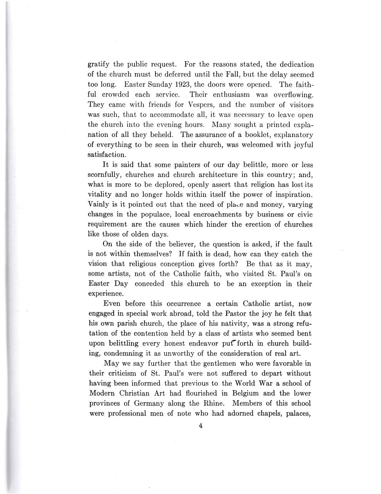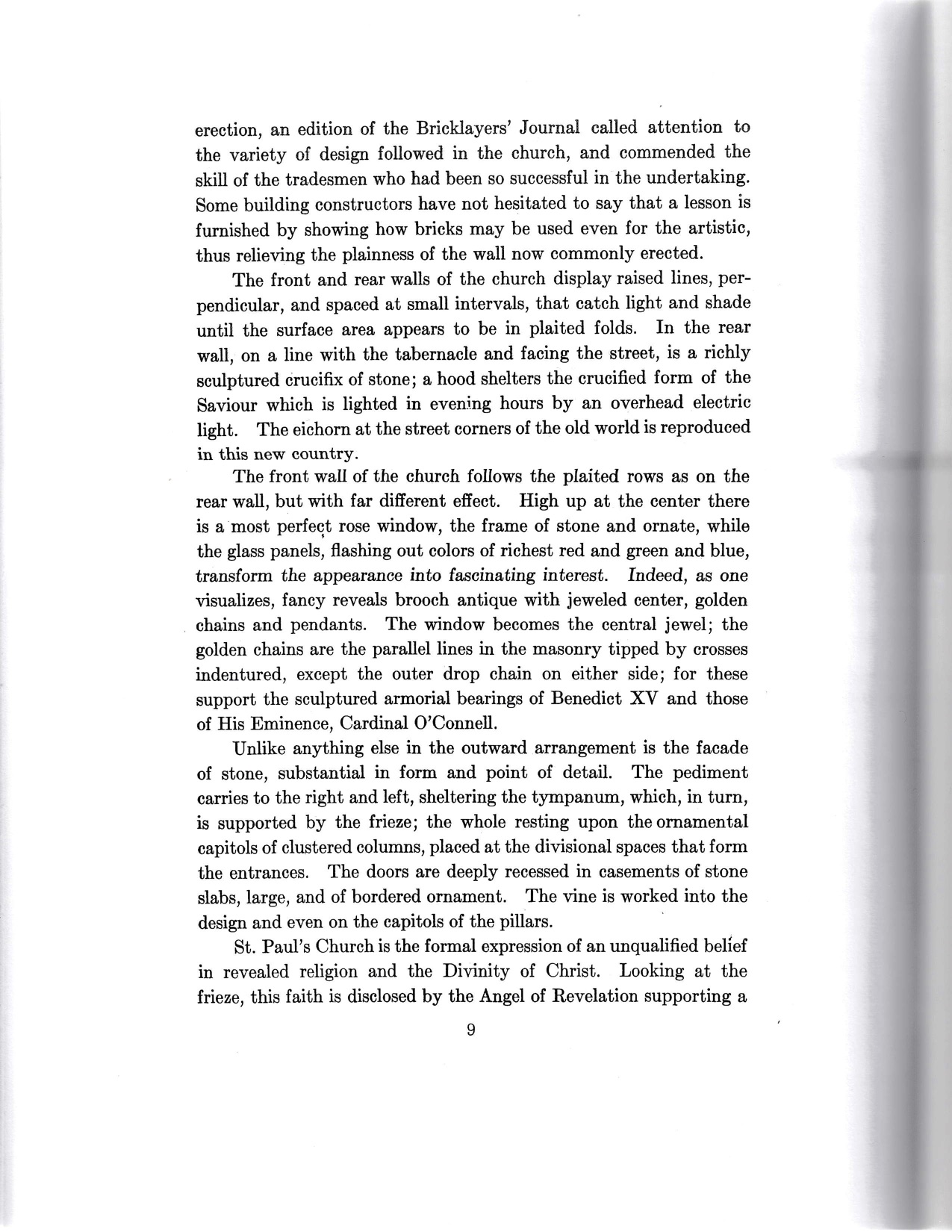 The booklet contains descriptions of the architectural and artistic features of the church, including the exterior style and location, the bas-relief of the Ascension above the embellished altar, the scenes portrayed in paintings around the church, the saints represented in stained-glass windows and statues, the design of the Stations of the Cross, and more. Fr. Ryan notes various things about the church, from practical aspects such as the dimensions of the interior and the estimate that “more than one million bricks were used in construction,” to more theological aspects of the church, such as the religious meanings of symbols and the statement that “St. Paul’s is the formal expression of an unqualified belief in revealed religion and the Divinity of Christ.” The text also features nine pages each with a black and white photograph of the church, distributed throughout.