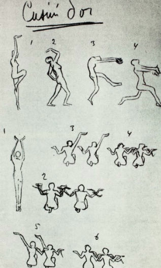 This text was created by esteemed choreographer Michel Fokine in order to preserve the nontraditional poses of his original ballet Le Dieu Bleu. Fokine choreographed Le Dieu Bleu for the Paris-based Russian ballet company, Ballet Russes, premiering the work on May 13, 1912. Ballet Russes was internationally recognized for its groundbreaking choreography and avant-garde interpretation of classical ballet. The company was largely comprised of Russian dancers and artists fleeing the conservatism of the Russian art scene for the freedom of expression that Paris allowed. Fokine similarly found his creativity to be stifled as a young dancer in Saint Petersberg’s Imperial Ballet Academy, and he transitioned to choreographing pieces abroad in order to find a more receptive audience for his reinterpretation of ballet. Fokine’s term as choreographer-in-residence for Ballet Russes marked a period of great experimentation for Fokine and the company, catalyzing a Parisian renaissance of ballet. In this text one can see Fokine’s attempts to move past the classical definition of ballet in Le Dieu Bleu. Whereas every step in the ballet canon corresponds to a specifically defined French term, Fokine’s unusual poses must be represented by drawn human silhouettes. Each silhouette in the text corresponds to a number, and each pose would have been taught to the dancers as corresponding to this numbered count in the music. Thus, this text can be directly translated into a phrase of movement. The translation of movement into text was made by Fokine in order to preserve his choreography for future stages of La Dieu Bleu. This transition from dance described in French terminology to figures can be equated to a transition from a modern alphabetic system to a more ancient logographic system, in which a figure corresponds to a certain pose. In Fokine’s transition from classical choreography, which comes complete with its own language, to modern choreography, one can see the attempt to recreate a language of movement from the very beginning.